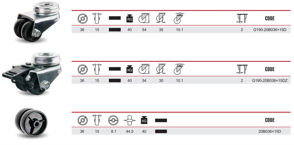 36 mm svart plast- eller nylonhjul, hjulfarge kan tilpasses, kunden bruker vanligvis hvit eller svart farge, 15 mm bred, glidelager, med 40 kg lastekapasitet.